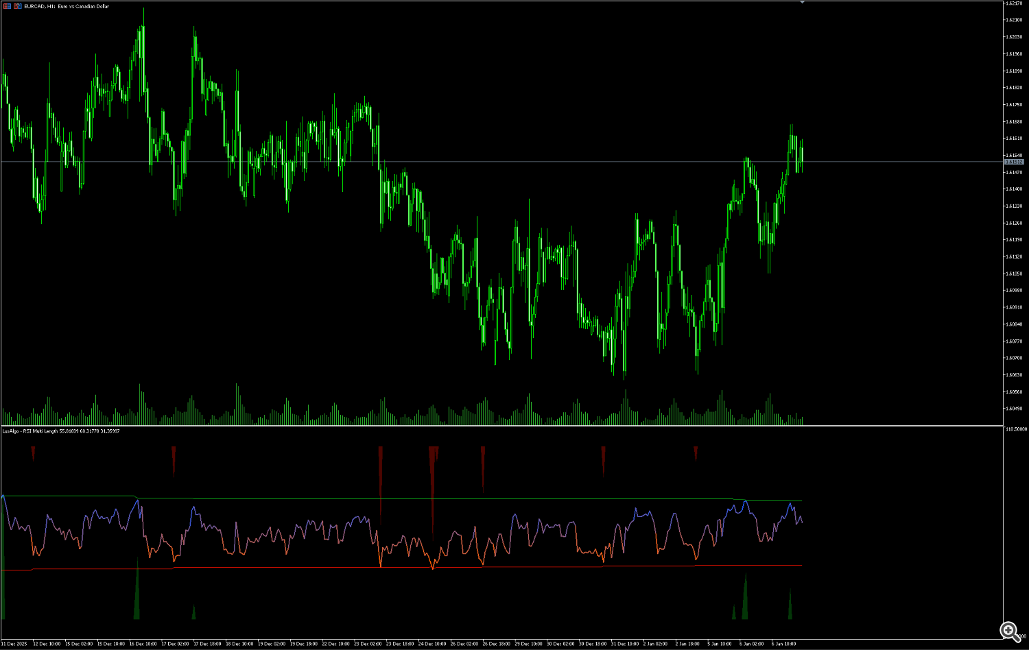 The RSI Multi Size indicator calculates a number of RSI durations concurrently and visualizes them collectively. When momentum throughout totally different lengths strikes in the identical route, development energy turns into simpler to establish. Divergence between RSI values can point out weakening momentum or potential market transitions.
