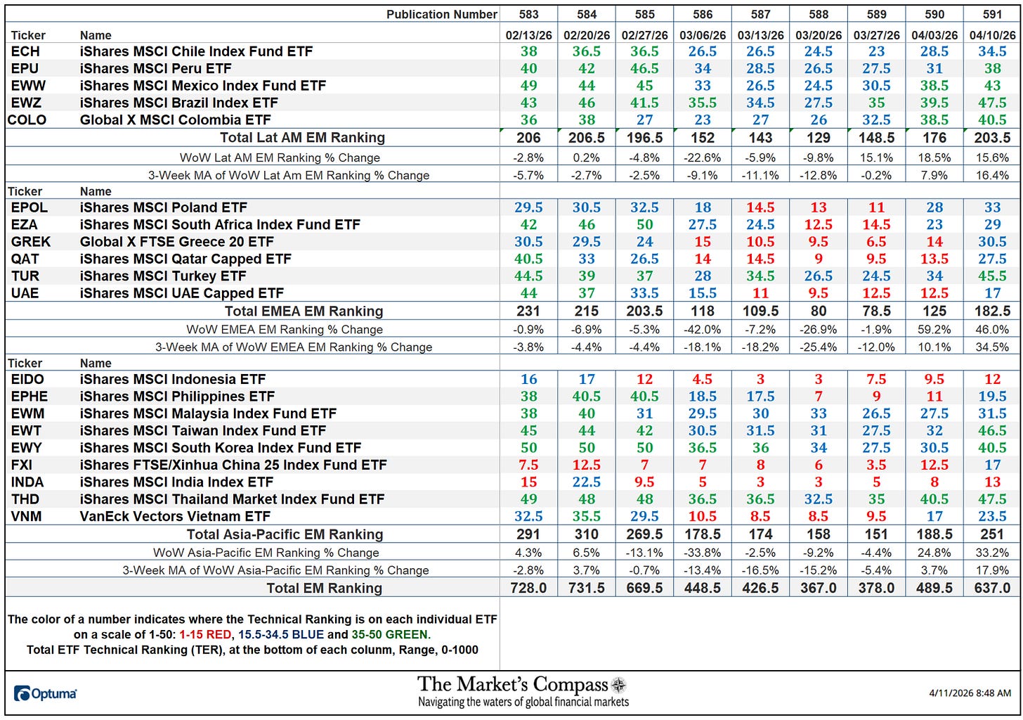 *The technical rating system is a quantitative strategy that makes use of a number of technical concerns that embody however will not be restricted to pattern, momentum, measurements of accumulation/distribution and relative energy of every particular person 20 EM Nation ETFs that may vary between 0 and 50. The Whole EM Technical Rating or “TEMTR” is the sum of the twenty particular person TRs and might be considered as an overbought / oversold indicator in addition to a affirmation / non-confirmation indicator. There may be additionally a Whole Rating for every geographic area that may be considered as a relative measurement on every week over week foundation.